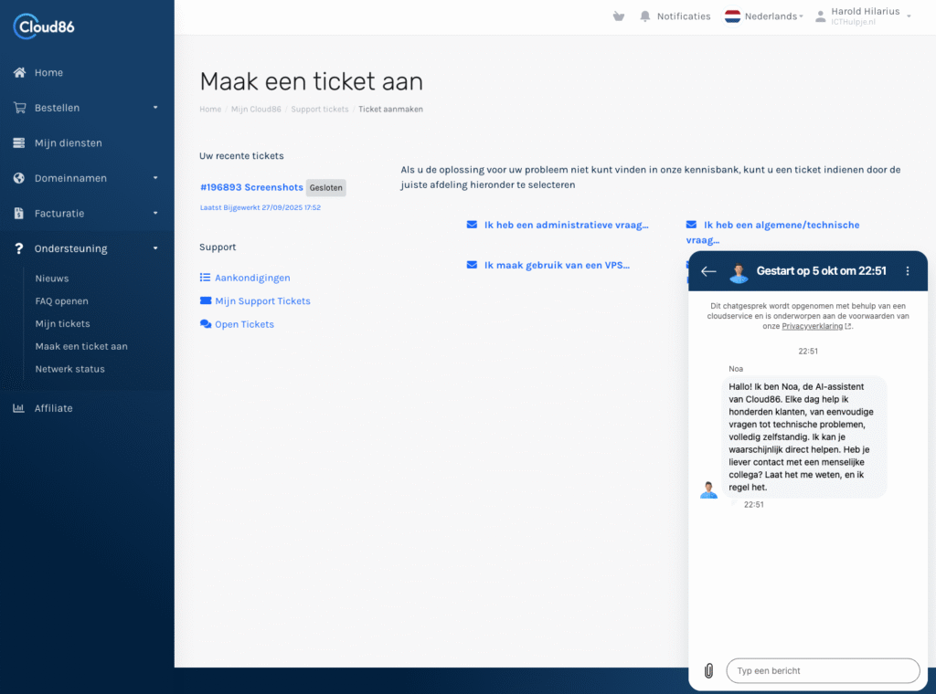 Een van de grootste voordelen in mijn Cloud86 ervaringen is de uitstekende klantenservice. De support is bereikbaar via een uitgebreide kennisbank, een ticketsysteem en live chat tijdens kantooruren. De reactiesnelheid is hoog en de medewerkers denken écht mee in oplossingen. Dit maakt het verschil met veel buitenlandse partijen die vaak alleen standaardantwoorden geven.