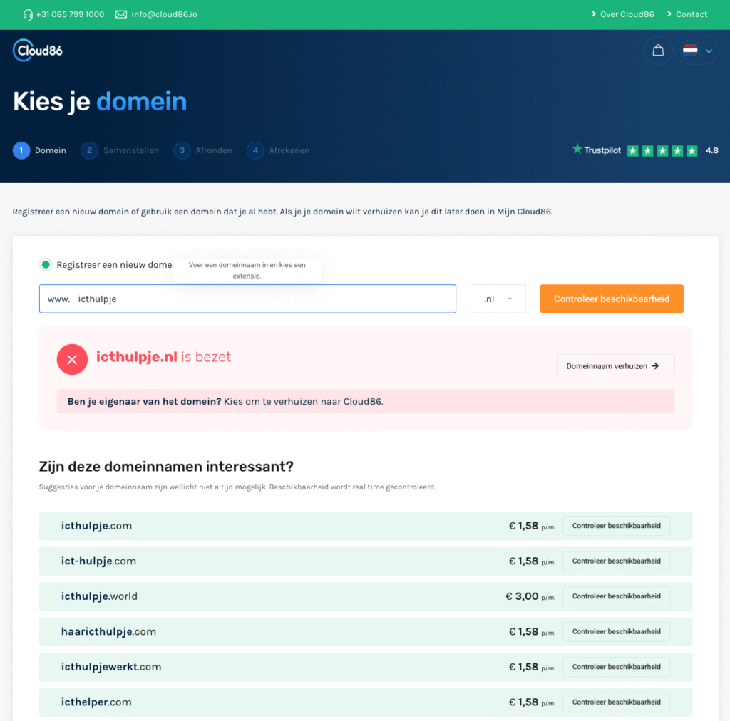 Een account aanmaken bij Cloud86 gaat eenvoudig en snel. Tijdens het bestelproces kies je een hostingpakket en koppel je meteen een domeinnaam. Je kunt een nieuw domein registreren of een bestaande domeinnaam verhuizen. Binnen enkele minuten na betaling ontvang je de inloggegevens en kun je direct aan de slag met je website of webshop.