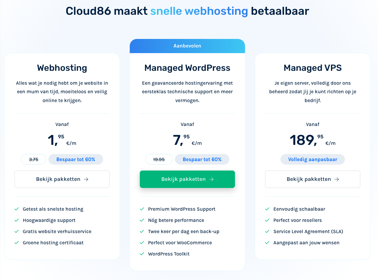 Cloud86 biedt drie hoofdcategorieën hosting aan: Shared Hosting, WordPress Hosting en VPS Hosting. Vooral de WordPress hosting van Cloud86 is populair, omdat deze speciaal is geoptimaliseerd voor snelheid en veiligheid. Alle pakketten bevatten standaard SSL, automatische backups en uitstekende prestaties. De prijs-kwaliteitverhouding is beter dan bij veel buitenlandse aanbieders.